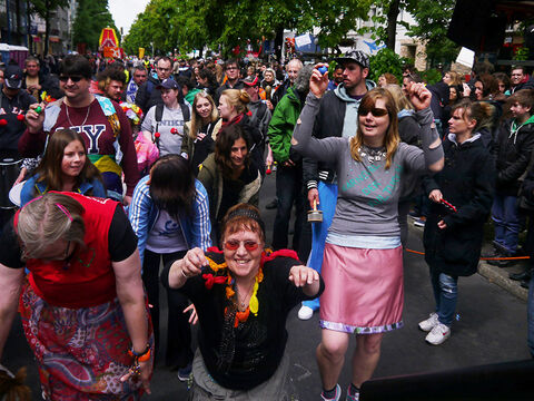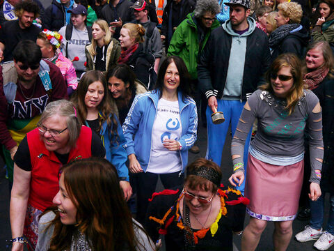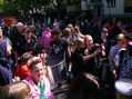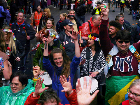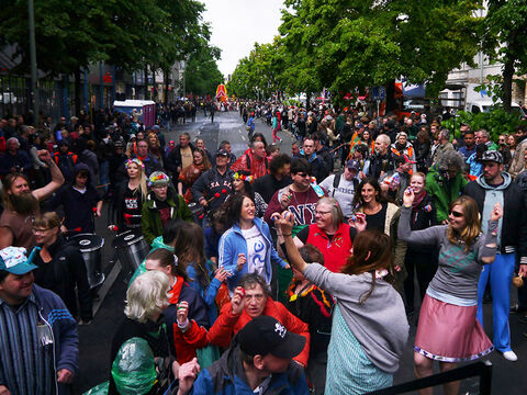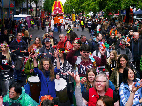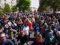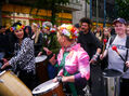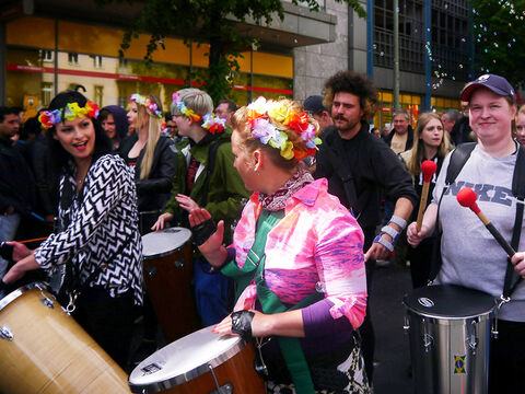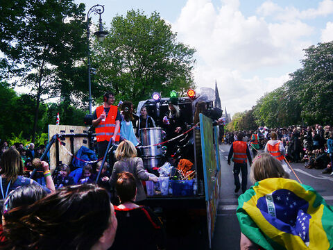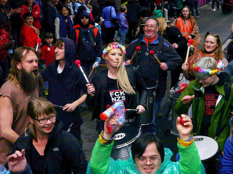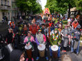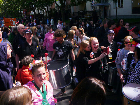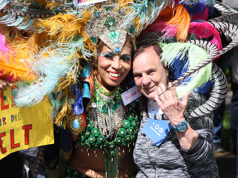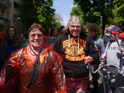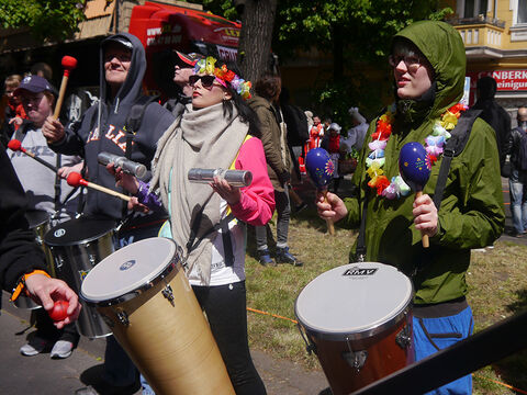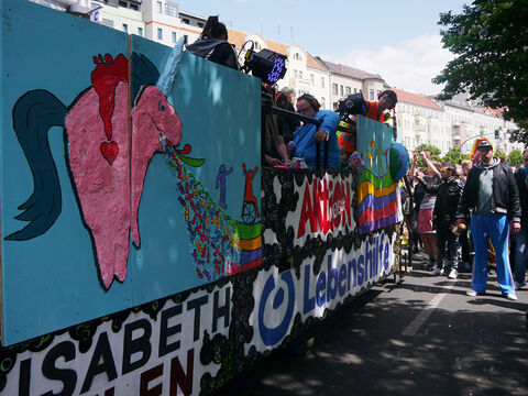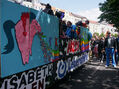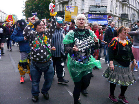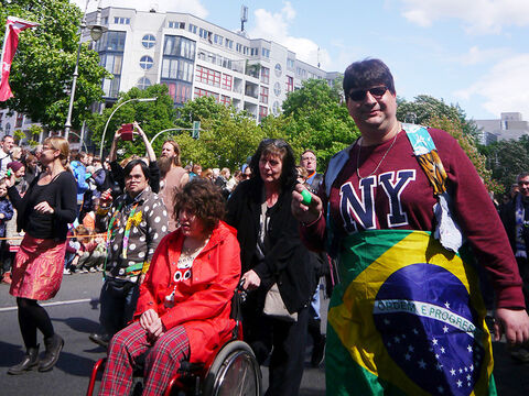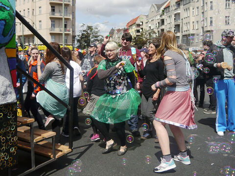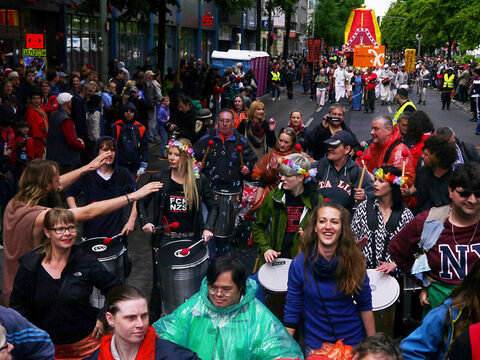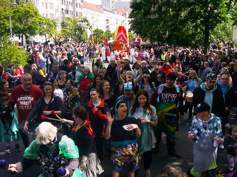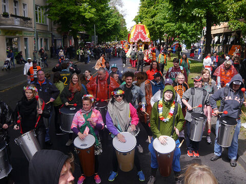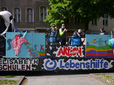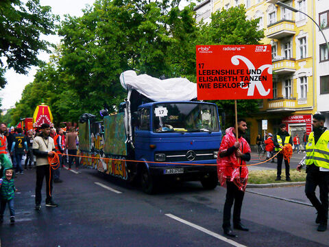 Eine bunte Truppe der Lebenshilfe Berlin und der Elisabeth-Schulen war mit einem Wagen und einer inklusiven Samba-Gruppe dabei. Menschen mit und ohne Behinderung trommelten, tanzten und hatten gemeinsam Spaß.